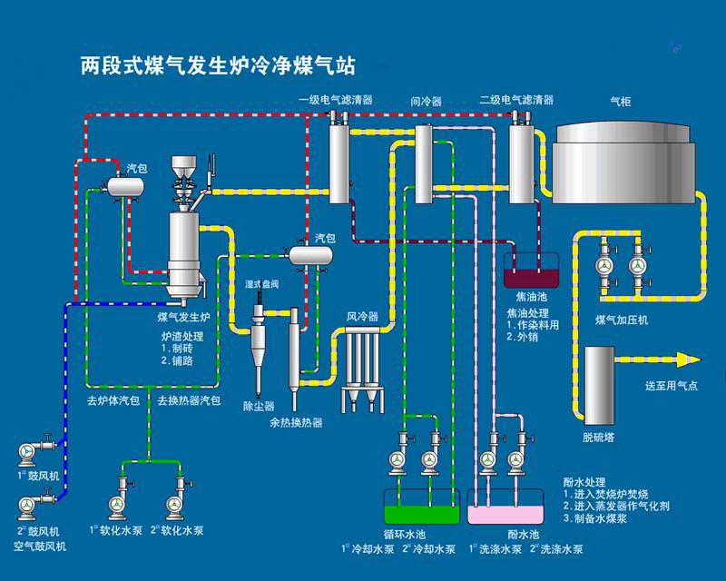 合格原料煤由電動(dòng)葫蘆提升至主廠房儲(chǔ)煤倉,再經(jīng)雙滾筒液壓加煤機(jī)加入爐內(nèi),煤受到來自氣化段煤氣的加熱干餾,干餾后半焦?fàn)顟B(tài)下的煤炭在氣化段與氣化劑(空氣、蒸氣)發(fā)生反應(yīng),氣化段生成的煤氣分為兩部分,一部分從兩段爐下段煤氣出口經(jīng)旋風(fēng)除塵器出爐,另一部分向上經(jīng)管與干餾煤氣混合從上段煤氣出口出爐。下段出口煤氣經(jīng)旋風(fēng)除塵器降溫除塵后進(jìn)入強(qiáng)制風(fēng)冷器,繼續(xù)除塵降溫,然后進(jìn)入間冷器進(jìn)一步降溫。上段出口煤氣進(jìn)入電捕焦油器除焦后,直接進(jìn)入間冷器,與下段煤氣混合,在混合中完成降溫,混合后煤氣進(jìn)入電捕輕油器,捕除輕油,煤氣經(jīng)加壓風(fēng)機(jī)加壓后送往水霧捕滴器脫水送往用戶。