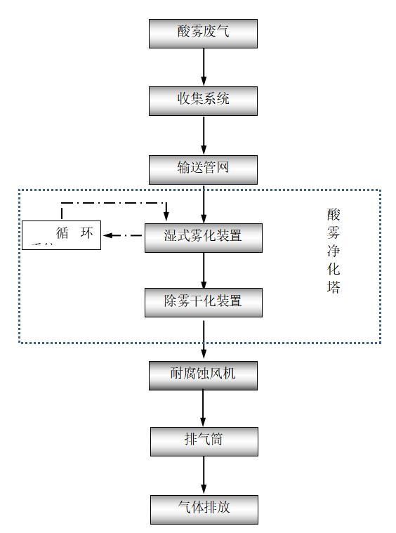 酸洗車間工藝產生的酸霧廢氣在耐腐蝕風機引起的負壓作用下,經收集系統(tǒng)收集后經輸送管網接入濕式霧化裝置底部,氣體由下向上,堿性吸收液由循環(huán)裝置通過布液設備以霧狀或小水滴均勻向下噴淋,氣液兩相在多面球填料形成逆流充分接觸反應,此填料具有表面積大,空隙率高,傳質性能好的優(yōu)異性能,經霧化后的吸收液均布在多面球填料上,液氣充分接觸吸收,有效捕捉廢氣中的污染物,從而除去酸霧中的硝酸及鹽酸。除去酸霧后的濕潤氣體經除霧干化裝置除去水霧后,經排放煙囪直接排放。
